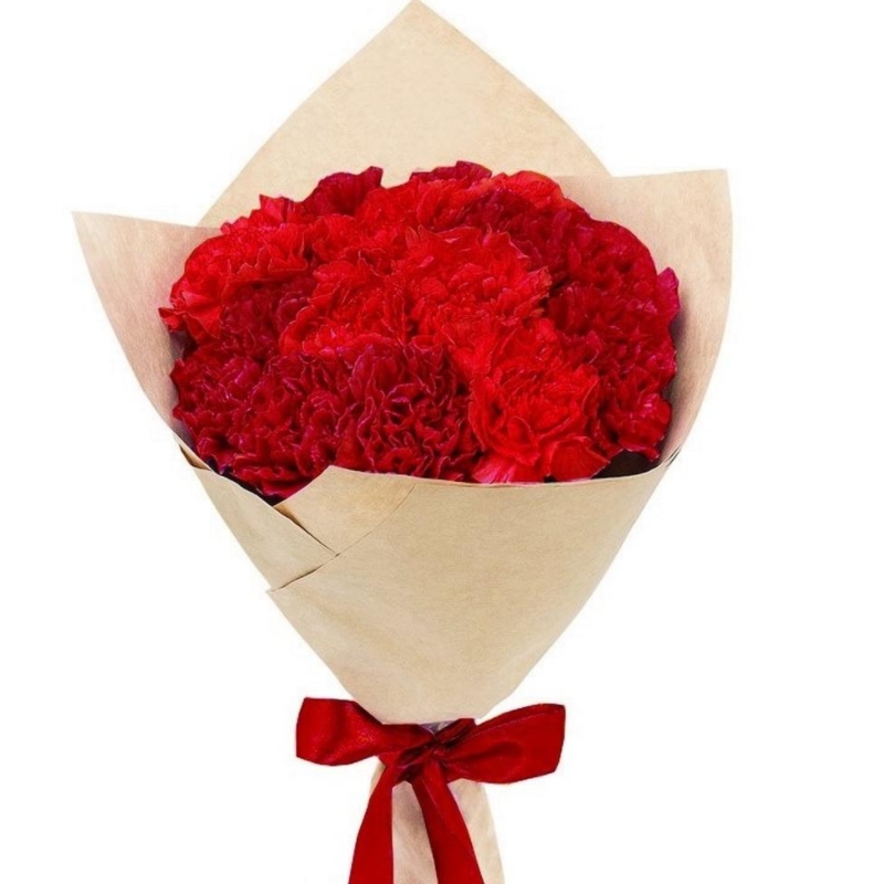 Букет состоит из 15 красных гвоздик , крафт, атласная лента.