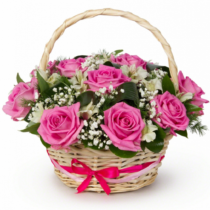 11 розовых роз, 2 ветки гипсофилы, зелень, корзина, оазис, атласная лента.