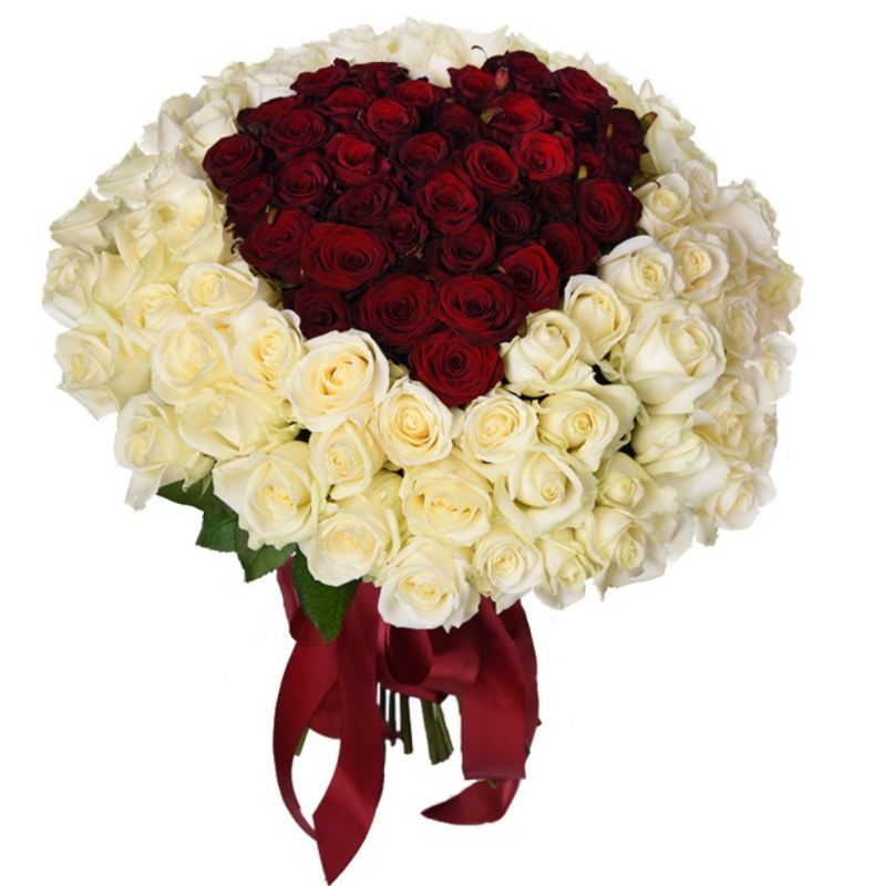 Букет из 101 белой и красной розы в виде сердца