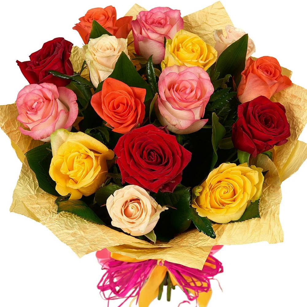 Букет состоит из MIX из 15 красных / желтых / кремовых / коралловых / розовых роз, красивая упаковка.