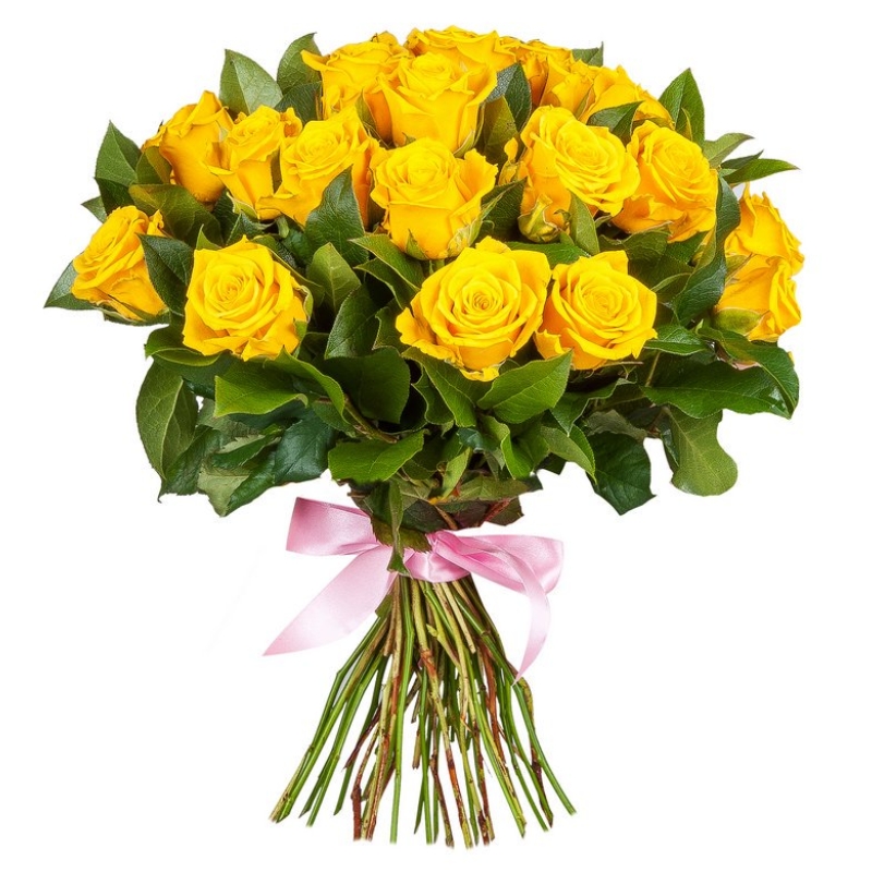 Букет состоит из 25 желтых роз, прозрачная упаковка, атласная лента.